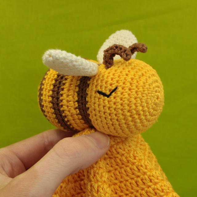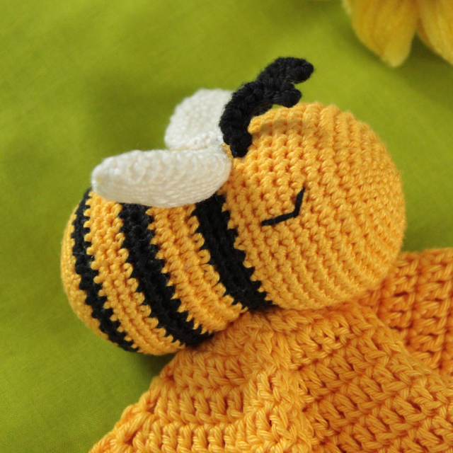 Facile à emporter partout, ce doudou Abeille mesure environ 18 cm de haut, une taille adaptée aux petites mains de bébé. Sa partie doudou en forme d'alvéole est entièrement crochetée à la main et mesure 25 cm de diamètre une fois dépliée.